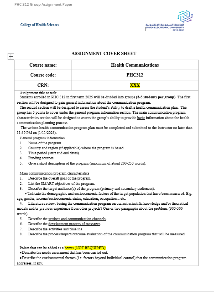 - يشمل: المشروع كامل على المتطلبات الموجودة في الكفر شيت الموحد لمادة PHC312